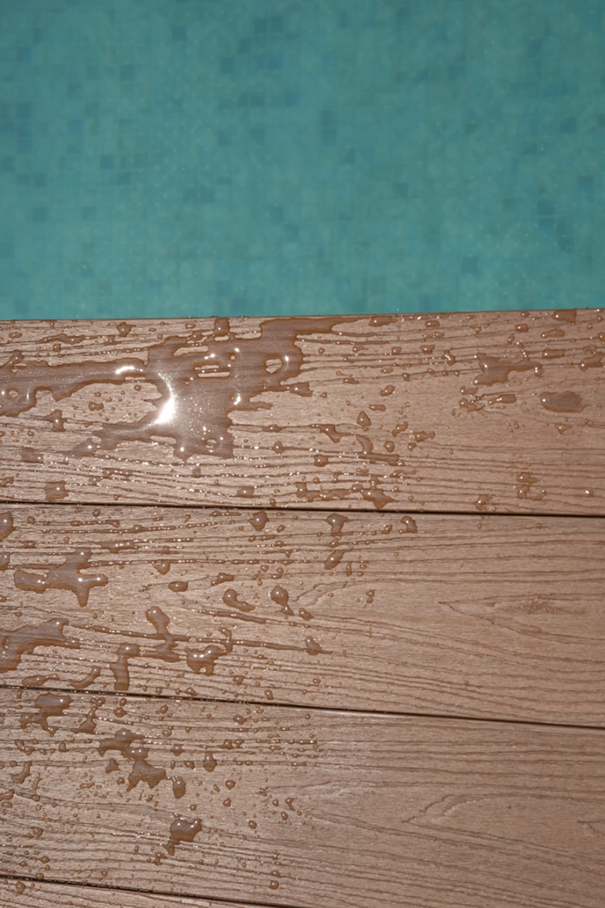 Resistencia al agua y la humedad. Perfecto para áreas de alberca, jardines y terrazas expuestas a lluvia. Su composición termoplástica impide la absorción de agua, eliminando el riesgo de hinchamiento o deformación que afecta a las maderas convencionales.