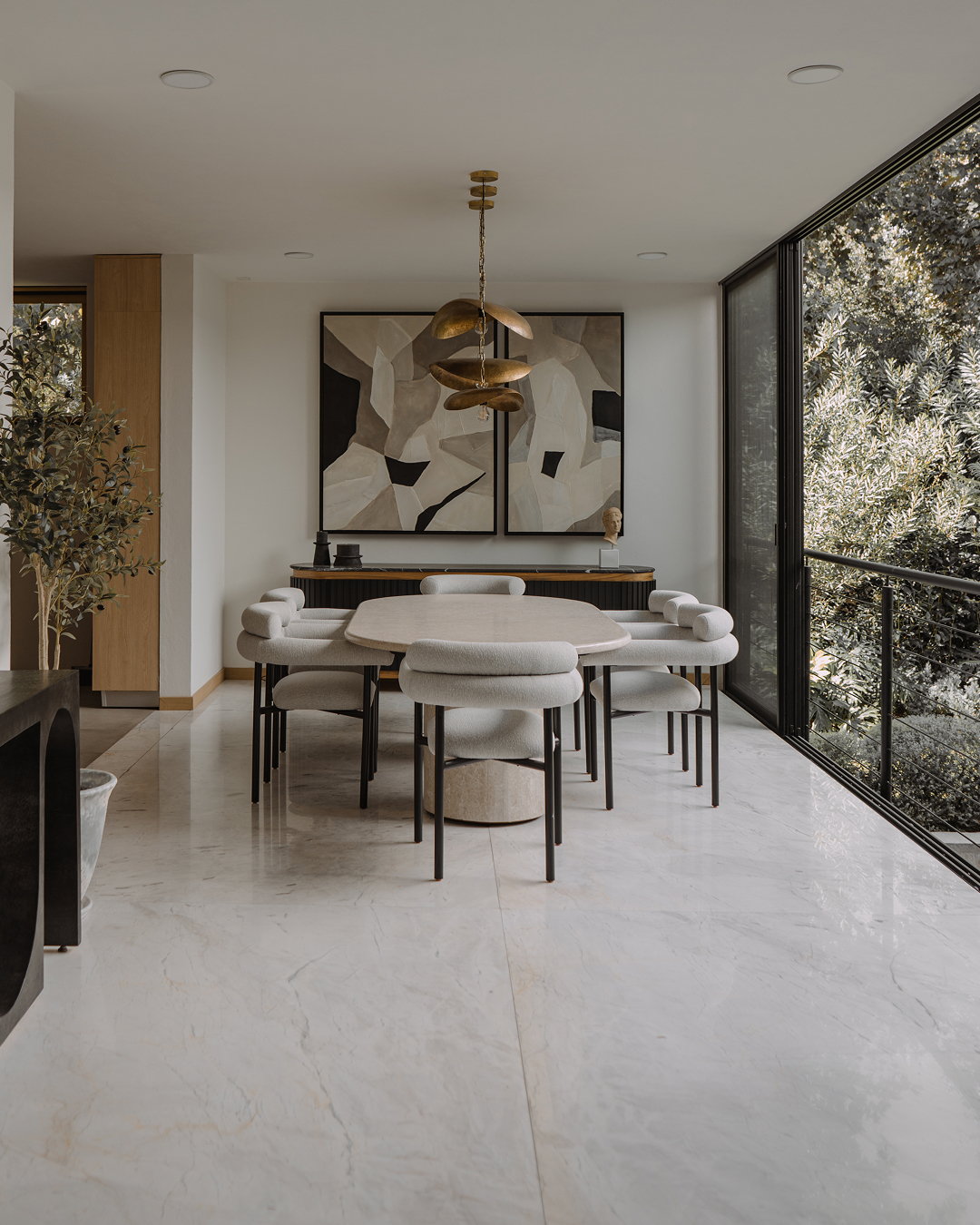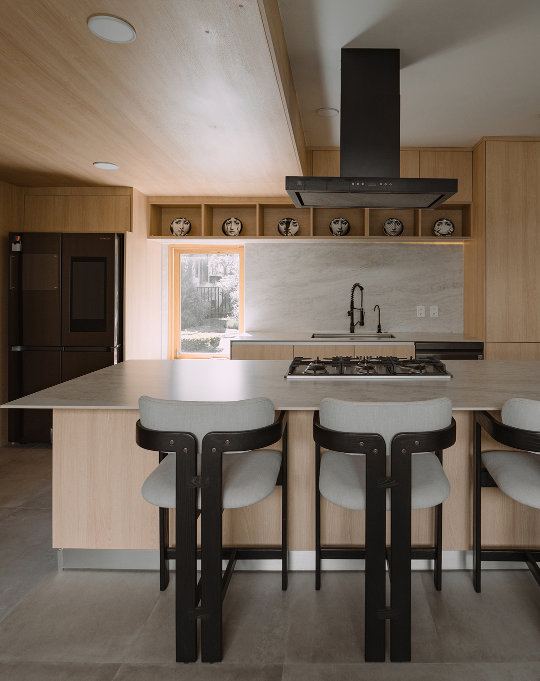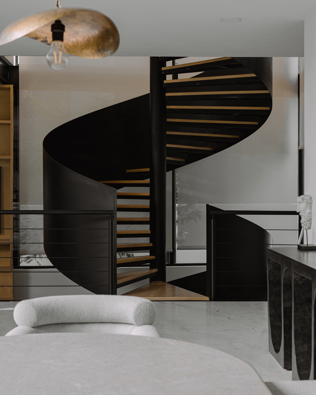 Esta residencia equilibra la fuerza de materiales como concreto, madera carbonizada y acero con la calidez del encino americano, el mármol Eros White y placas tecnológicas, logrando una armonía perfecta entre lo industrial y lo natural.
